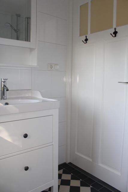 - badkamer voorzien van kwartronde lage douchebak met douchecabine, wandcloset en vaste wastafel